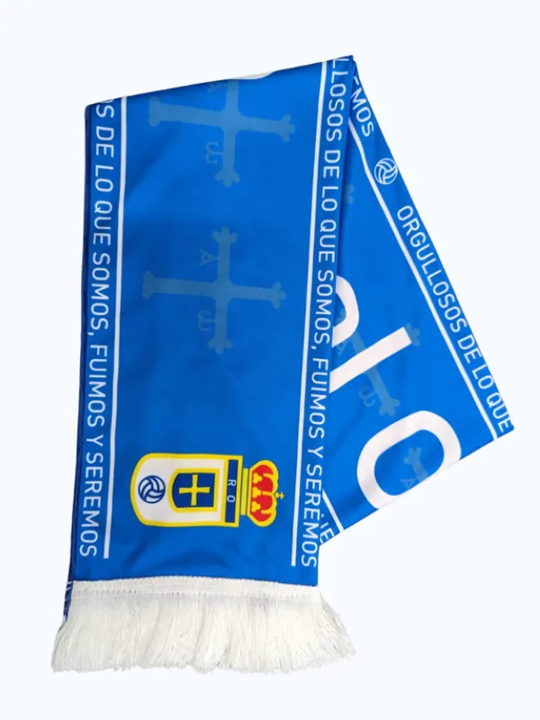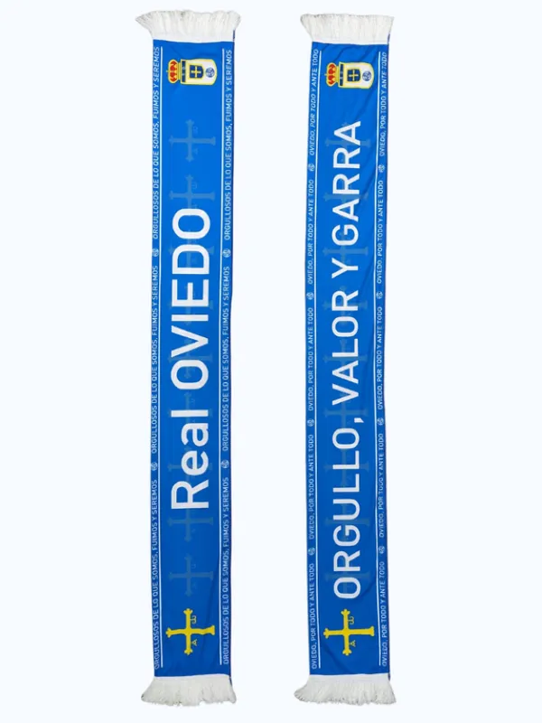 Bufanda Real Oviedo de raso a doble cara con impresión digital de las letras «Real Oviedo» por una cara y en la otra cara el lema «Orgullo, Valor y Garra».