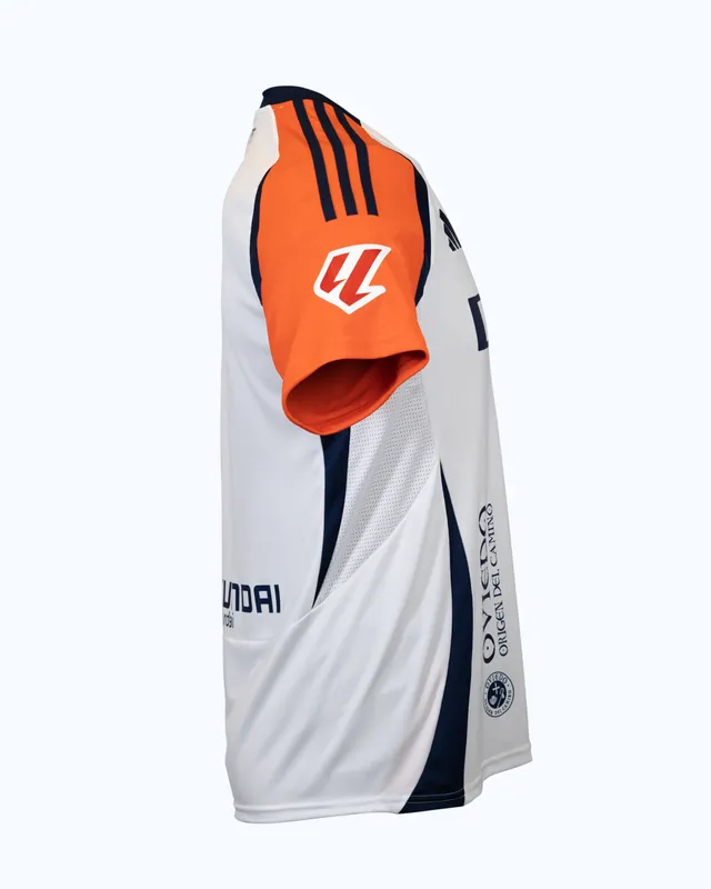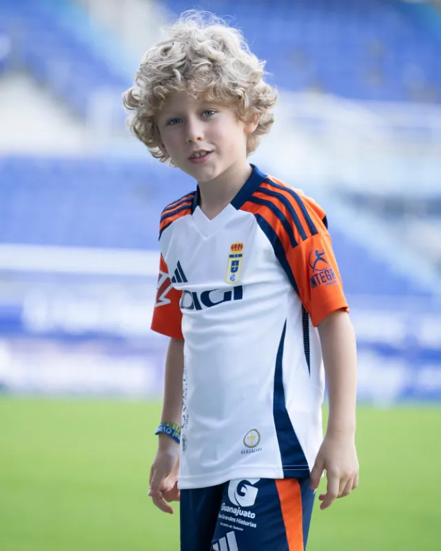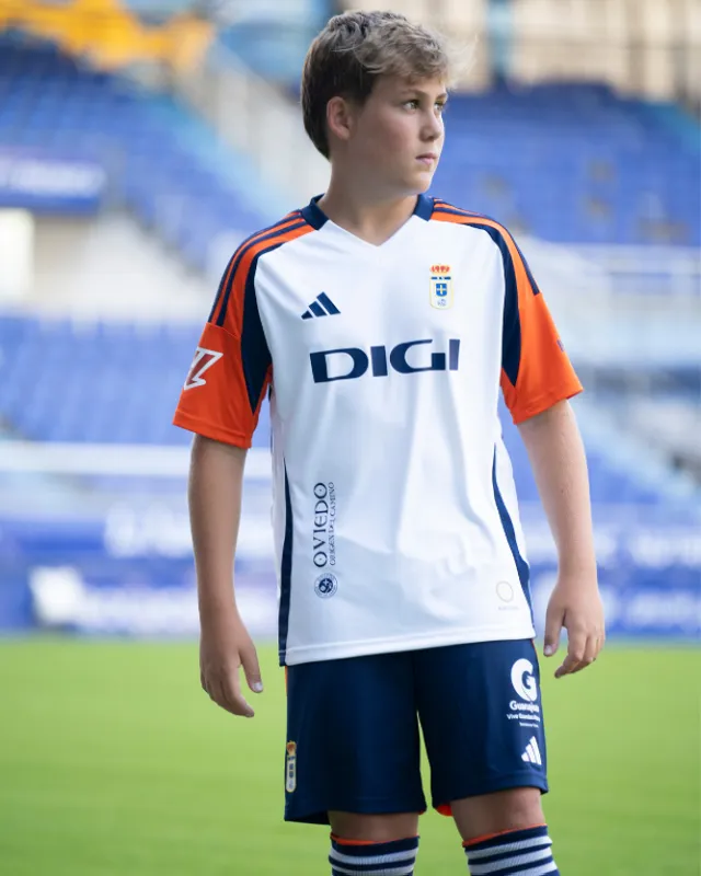 Camiseta niño segunda equipación del Real Oviedo 24/25 en color blanco con las mangas en naranja. Mangas con las tres bandas en marino. El tejido de tecnología AEROREADY favorece la expulsión del sudor y la transpirabilidad.