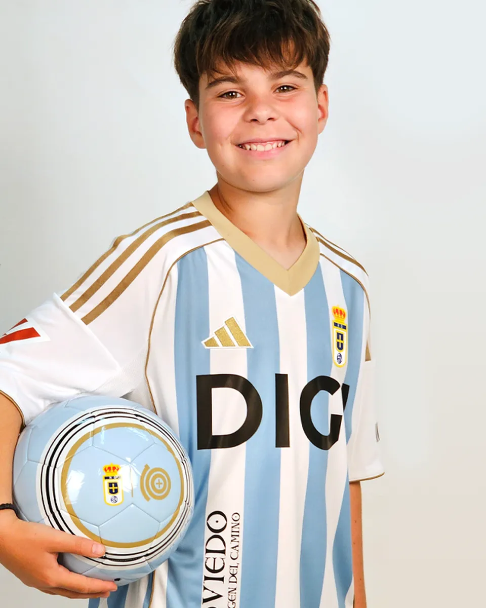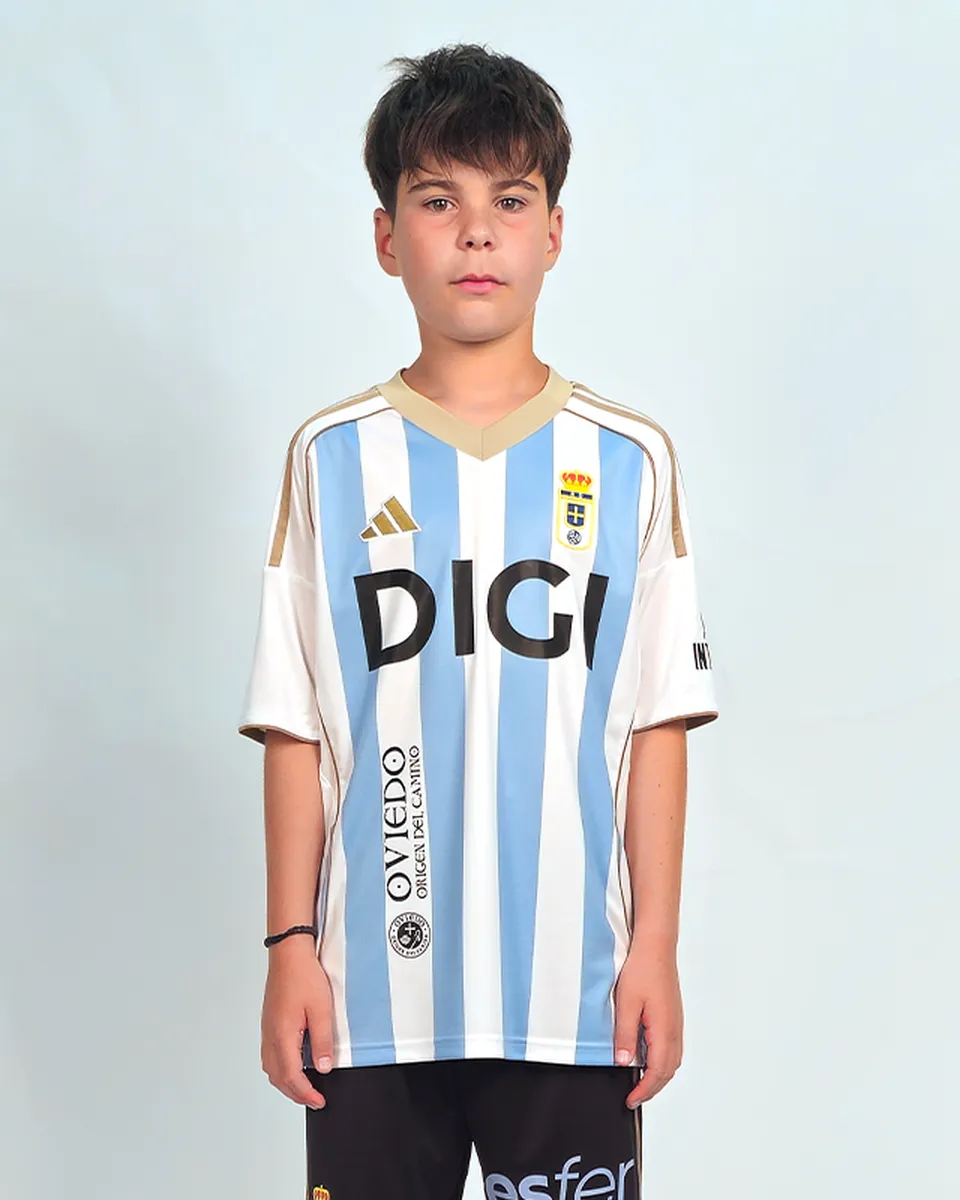 Camiseta niño de la tercera equipación del Real Oviedo para la temporada 25/26, en color blanco con rayas en azul celeste y detalles en dorado.