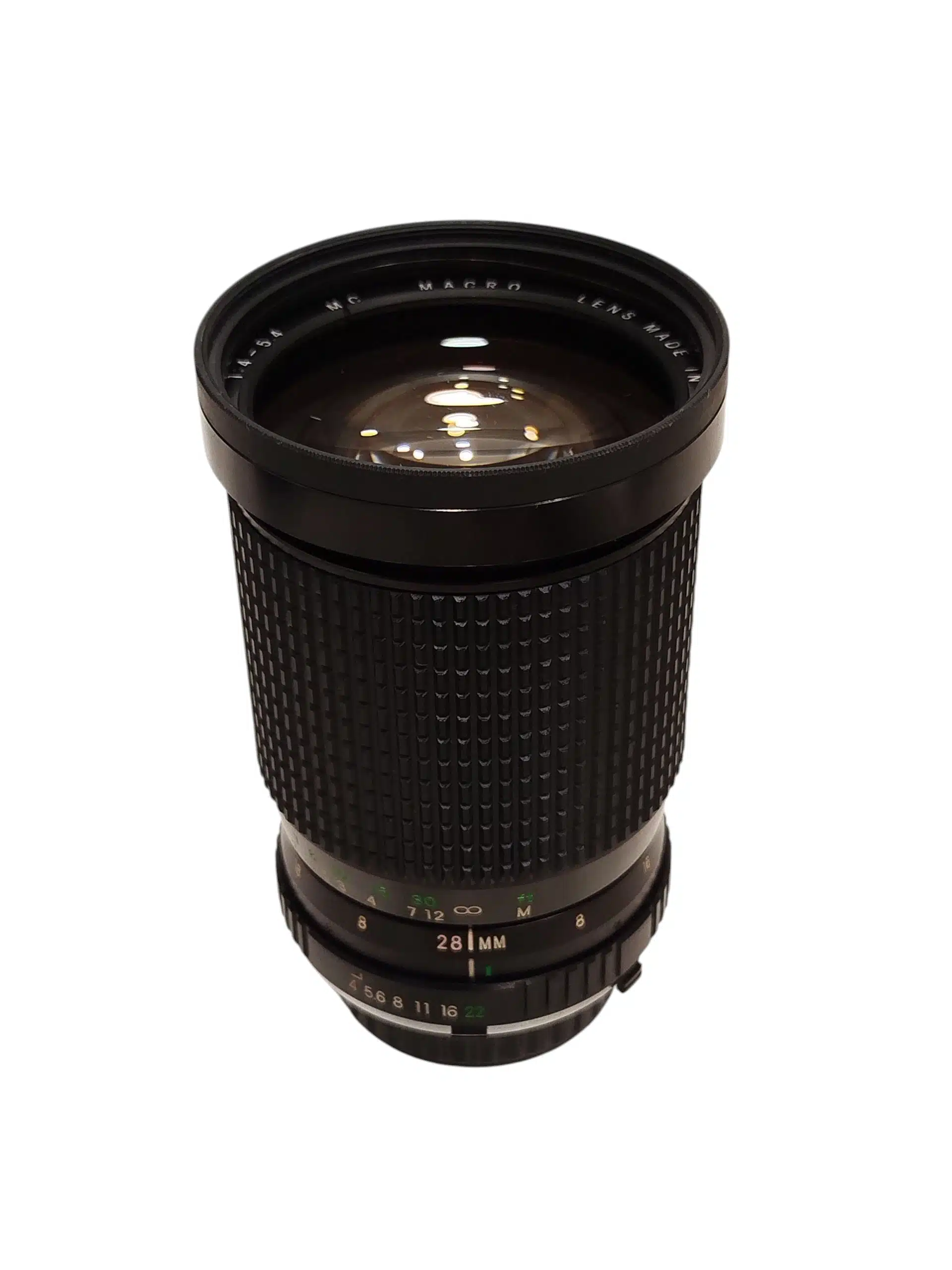 Objetivo prime vintage Cosina 28 mm f/2.8 Macro, ideal para quienes quieren adentrarse en la fotografía manual. Se monta en rosca o bayoneta (depende de versión), con enfoque manual. Aunque dice “macro”, no suele alcanzar reproducción 1:1, pero permite acercamientos significativos (close-up). Destaca por su construcción metálica robusta, buen rendimiento al detenerlo unos pasos respecto a máxima apertura, y un carácter retro en nitidez y contraste que lo hace muy apreciado por quienes disfrutan revelar el carácter de lente antigua.