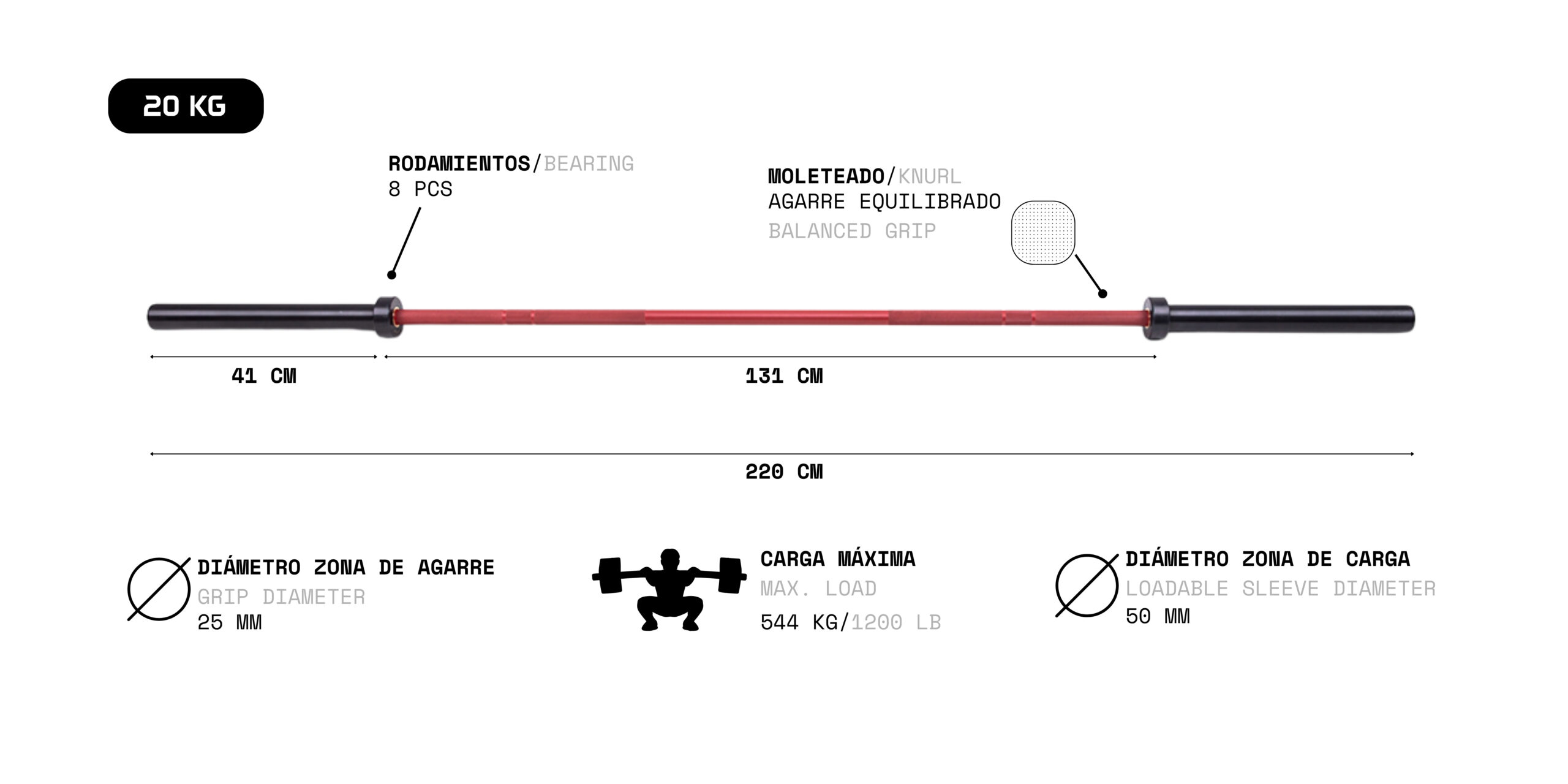 Equipadas con 8 rodamientos de agujas y 2 casquillos de bronce, proporcionan un giro suave y estable, reduciendo la tensión en muñecas y facilitando movimientos técnicos. El moleteado estándar IWF de 1,2 mm ofrece un agarre seguro y cómodo en todo tipo de levantamientos.