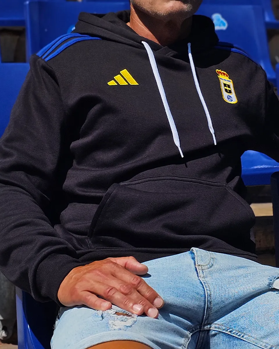 Sudadera capucha adulto del Real Oviedo 25/26 en color negro. Se ha confeccionado en un tejido suave de algodón con puños de canalé y una capucha ajustable.