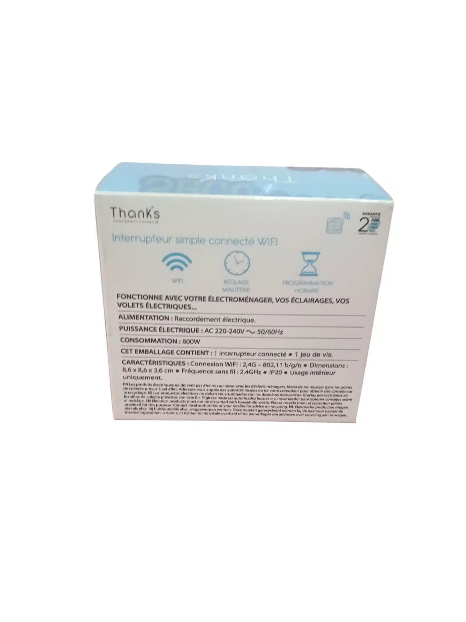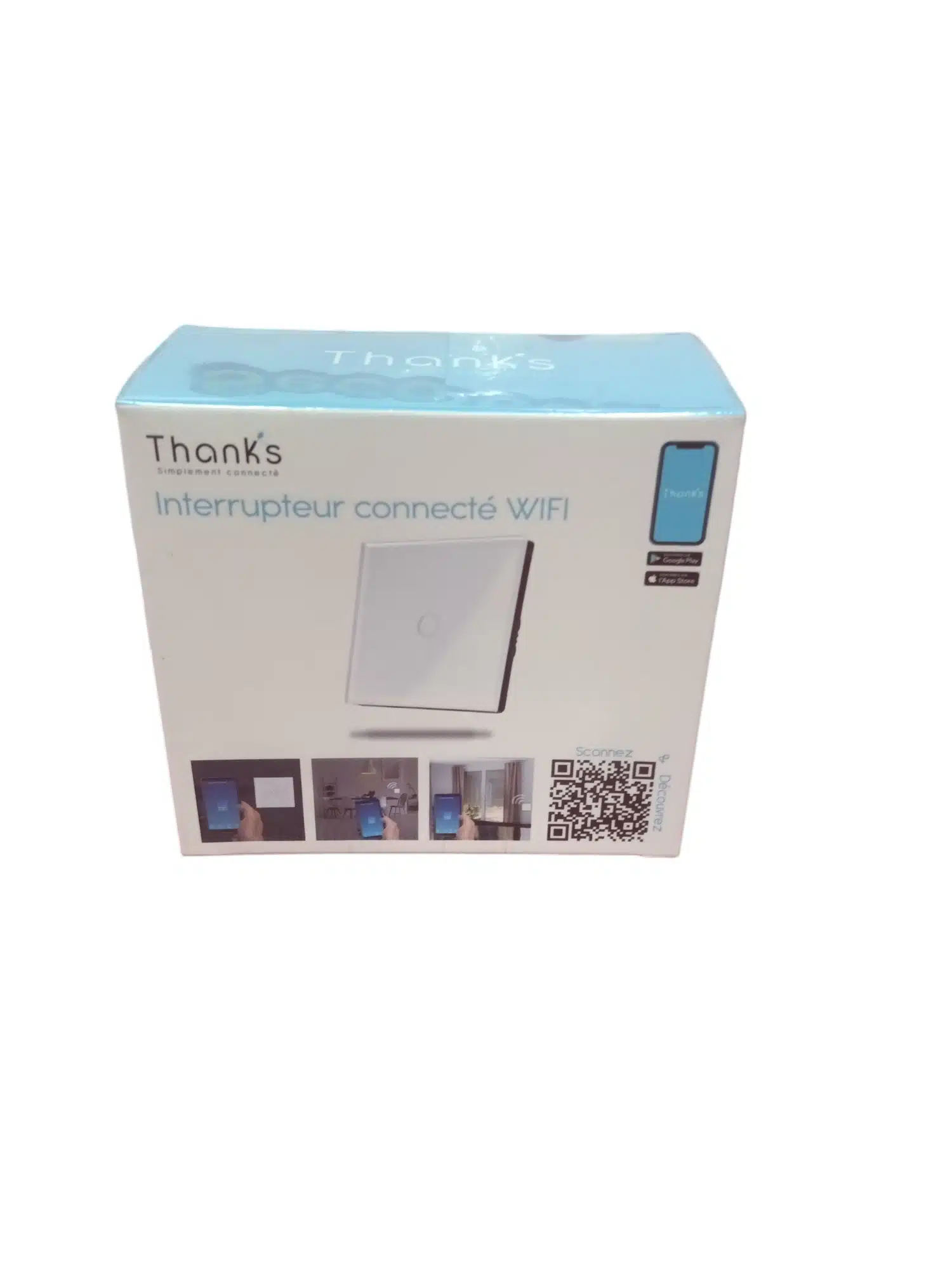 Interruptor vía wiifi, 1 botón. Controlable mediante wifi y por Android y iOS. Color blanco, plano.
