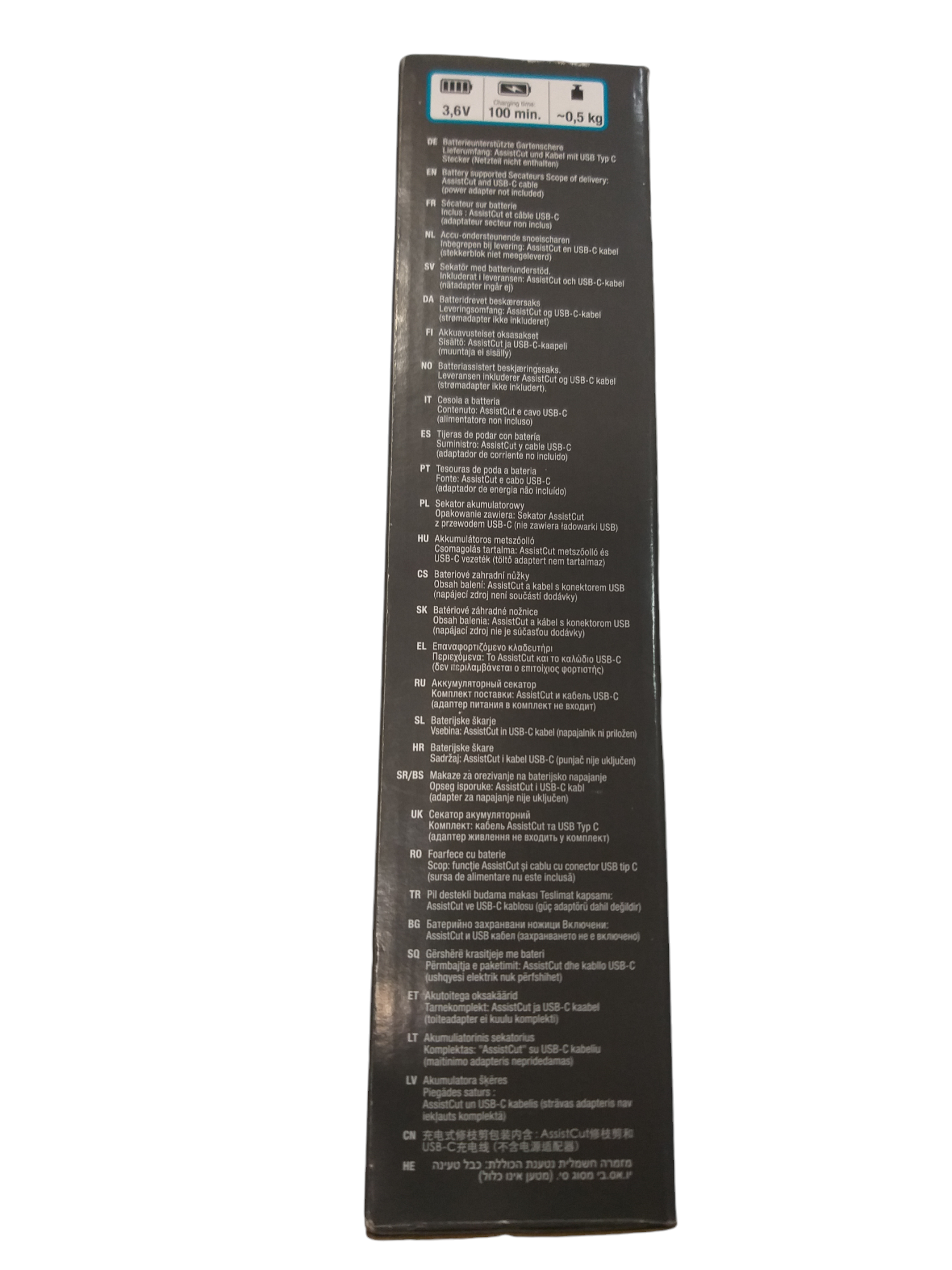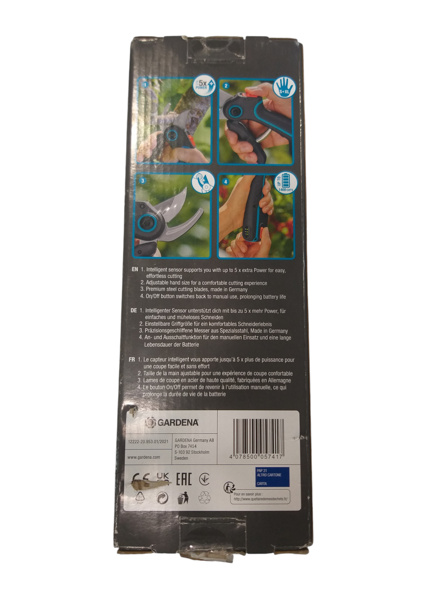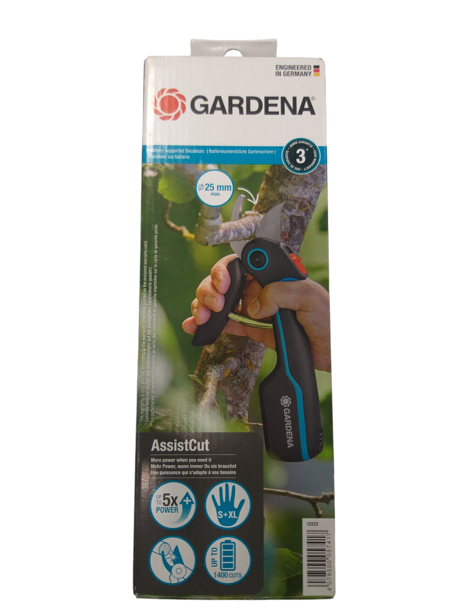 La tijera de poda a batería Assistcut de Gardena es ideal para tus trabajos de poda y jardinería continuados en los que se necesitas una asistencia en el corte. Tan pronto como el sensor integrado en la herramienta detecta resistencia en la rama o planta, el motor integrado se enciende y le ayuda con hasta 5 veces más de potencia para realizar el corte sin esfuerzo. Con la podadora a batería Assistcut podrá recortar sin esfuerzo ramas con diámetro de 25 milímetros. Asistencia al corte con multiplicador de fuerza x5: Las tijeras de podar con batería tienen un sensor inteligente, que proporciona hasta 5 veces más potencia (en comparación con las tijeras de podar habituales) al cortar ramas más gruesas tan pronto como se detecta resistencia. Las tijeras de podar reducen la tensión de la mano, lo que facilita aún más las tareas de jardinería sin esfuerzo. Hasta 1400 cortes con una sola carga: La batería permite realizar hasta 1400 cortes sin esfuerzo con una sola carga completa de batería de 3,6V. Además se puede cargar rápidamente y fácilmente en cualquier momento con un cable USB-C incluido (cargador de corriente no incluido). Cuando la tijera se ha descargado se puede seguir utilizando como una tijera de poda manual. La función de encendido / apagado también garantiza una larga duración de la batería, ya que no se descargará con el tiempo. La batería se puede cargar fácil y rápidamente al 100% en 100 minutos utilizando el cable USB-C incluido (adaptador de corriente no incluido). Corte preciso de bypass ¿Cómo es el tipo de corte de una tijera bypass? Dos cuchillas afiladas se deslizan una sobre la otra y ofrecen un corte preciso y limpio ideal para mantener tus plantas en perfecto estado de salud. Las tijeras con corte baypass son recomendables para plantas delicadas, brotes o ramas más verdes que oponen menor resistencia pero requieren de un corte limpio y preciso para que la planta no se marchite. Por lo tanto, las tijeras de podar GARDENA son ideales para cortar flores, ramas y madera fresca sin que tus plantas sufran daños. Ligera para un trabajo más cómodo. La tijera podadora Assistcut solo pesa 500g, lo que permite reducir la fatiga a la hora de podar y una mejor manejabilidad accediendo a todo tipo de ramas con facilidad. Diseño ergonómico: Su diseño ergonómico se adapta a todos los tamaños de mano posibles para una experiencia de corte más cómoda. Posibilidad de almacenar la herramienta de forma segura Gracias al seguro de bloqueo de una mano, las tijeras de podar se pueden cerrar fácilmente con una mano y guardar de forma segura después de su uso. Producto de primera calidad Los productos de calidad GARDENA fabricados en Alemania son sinónimo de rendimiento óptimo, fiabilidad e innovación continua. Cuida tus plantas prolongando su vida: Cortes suaves y limpios utiliza las tijeras podadoras de jardín Assistcut para obtener cortes limpios en ramas gruesas y delgadas a la vez que favorece el crecimiento saludable de las plantas gracias a las cuchillas de acero inoxidable.